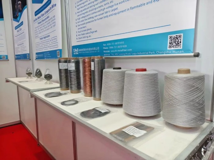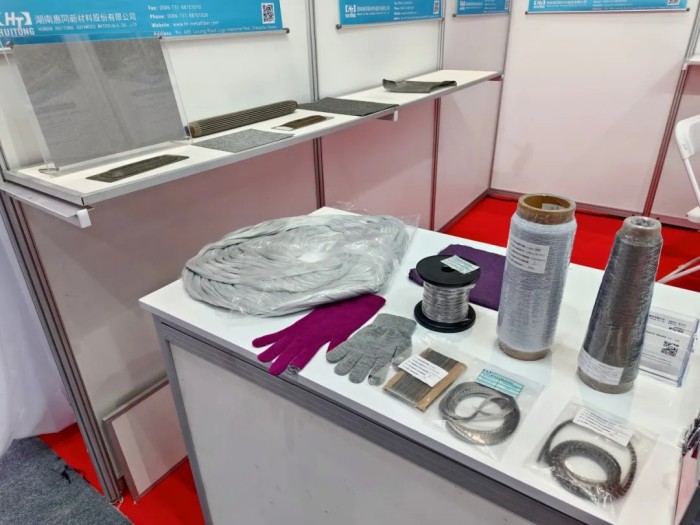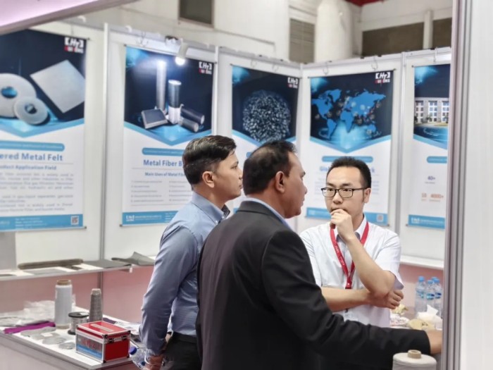 惠同新材攜各種材質金屬纖維及其制品,包括不銹鋼纖維、銅纖維、鎳纖維等,及純金屬纖維織物、金屬纖維混紡紗線、金屬纖維過濾氈等金屬纖維制品,首次展示于雅加達國際展覽中心,深深地吸引了當地客商的注意。